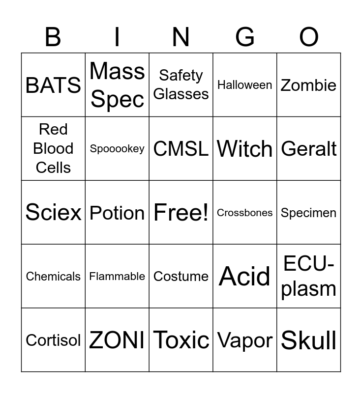 This bingo card has a free space and 51 words: Mummy, Skull, !, Toxic, Flammable, Gloves, Mass Spec, Scary, Red Blood Cells, October, Spooookey, Halloween, ECU-plasm, Acid, Mass Hunter, Spider, CMSL, Crossbones, Test Tube, Zombie, Potion, Vapor, BATS, Witch, Contamination, Lazarus, Geralt, Monster, Cortisol, Safety Glasses, Whole Blood, Beaker, Ghosts, Plasma, Sully, ZONI, Dissolve, Skeleton, Voltage, Vampire, Specimen, Chemicals, Pumpkin, Adrenaline, Hazardous, Corrosion, Sciex, Poison, ION, Costume and CATs.
