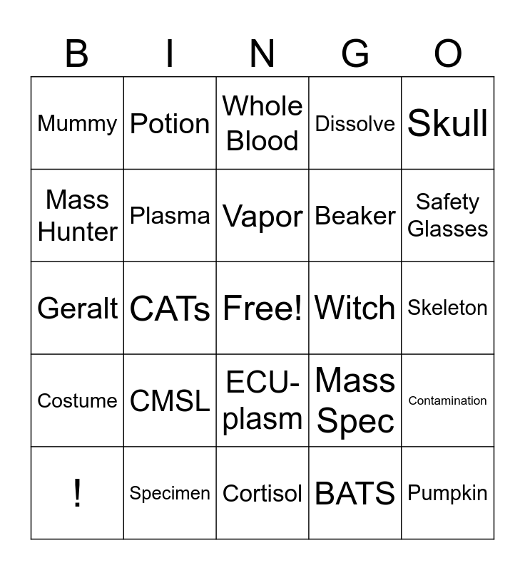 This bingo card has a free space and 51 words: Crossbones, Pumpkin, Lazarus, Cortisol, CMSL, Adrenaline, Potion, Spider, Mass Hunter, Corrosion, Plasma, Dissolve, Contamination, Mass Spec, Sully, Voltage, Vapor, Witch, Hazardous, Skull, CATs, BATS, Mummy, Beaker, Spooookey, Toxic, Safety Glasses, Red Blood Cells, !, Whole Blood, Scary, Zombie, Monster, Poison, Chemicals, Specimen, Gloves, Sciex, Flammable, Ghosts, Skeleton, Costume, ZONI, ION, Vampire, Halloween, Geralt, Acid, October, ECU-plasm and Test Tube.