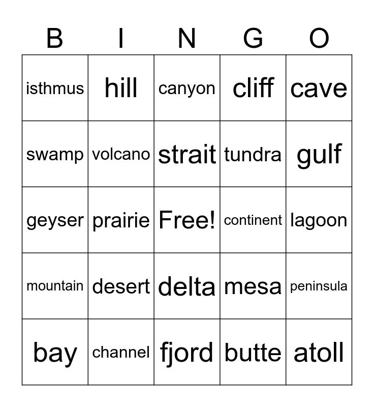 This bingo card has a free space and 44 words: archipelago, atoll, badlands, bay, beach, butte, canyon, cape, cave, channel, cliff, continent, delta, desert, dune, fjord, forest, geyser, glacier, gulf, hill, iceberg, island, isthmus, jungle, lagoon, lake, marsh, mesa, mountain, ocean, peninsula, plain, plateau, prairie, river, sea, sound, strait, swamp, tundra, valley, volcano and waterfall.
