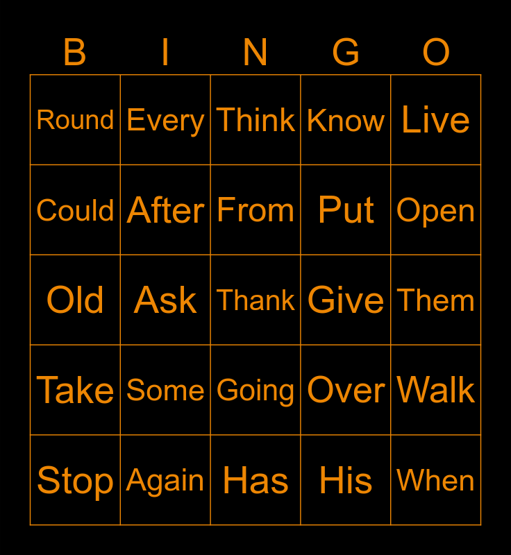 This bingo card has 25 words: Some, Has, From, Stop, Live, Round, Could, Every, Give, Going, Put, Old, Over, Walk, After, When, Them, Think, Open, Ask, Thank, Again, Take, Know and His.