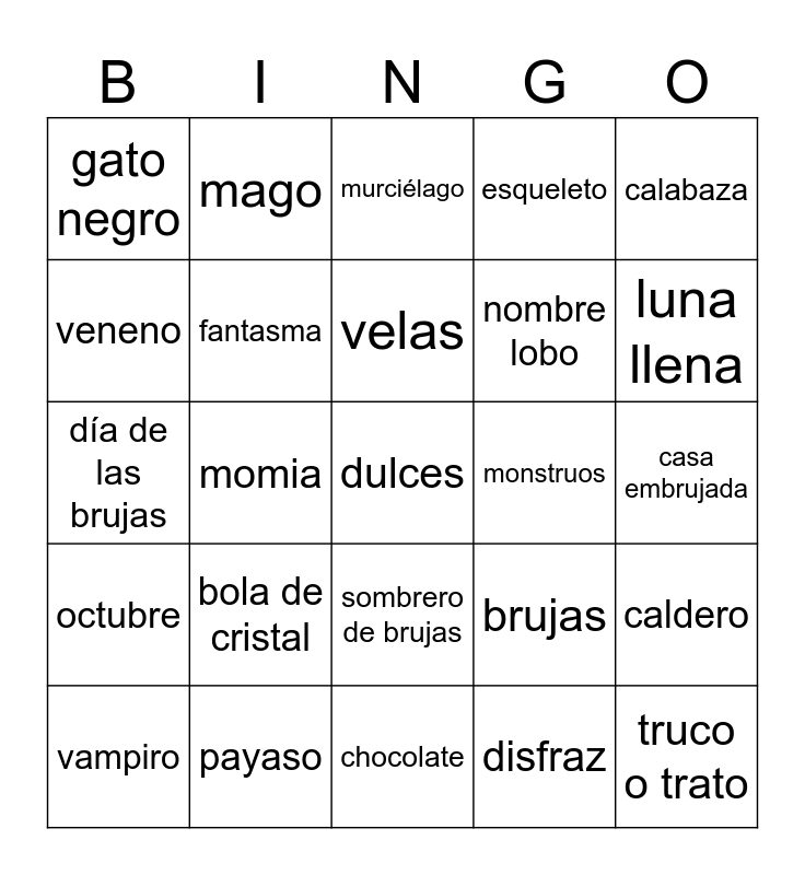 This bingo card has a free space and 29 words: vampiro, escoba de brujas, momia, araÑa, gato negro, murciélago, fantasma, bola de cristal, monstruos, payaso, casa embrujada, truco o trato, chocolate, disfraz, luna llena, hechizo, sombrero de brujas, octubre, calabaza, día de las brujas, brujas, zombies, nombre lobo, veneno, esqueleto, mago, caldero, velas and varita.