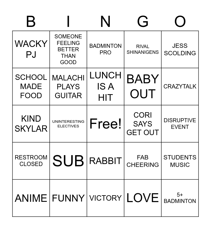 This bingo card has a free space and 24 words: SUB, FUNNY, LUNCH IS A HIT, ANIME, JESS SCOLDING, WACKY PJ, SCHOOL MADE FOOD, SOMEONE FEELING BETTER THAN GOOD, CORI SAYS GET OUT, RABBIT, BABY OUT, KIND SKYLAR, FAB CHEERING, STUDENTS MUSIC, MALACHI PLAYS GUITAR, LOVE, DISRUPTIVE EVENT, BADMINTON PRO, CRAZYTALK, UNINTERESTING ELECTIVES, 5+ BADMINTON, RESTROOM CLOSED, RIVAL SHINANIGENS and VICTORY.