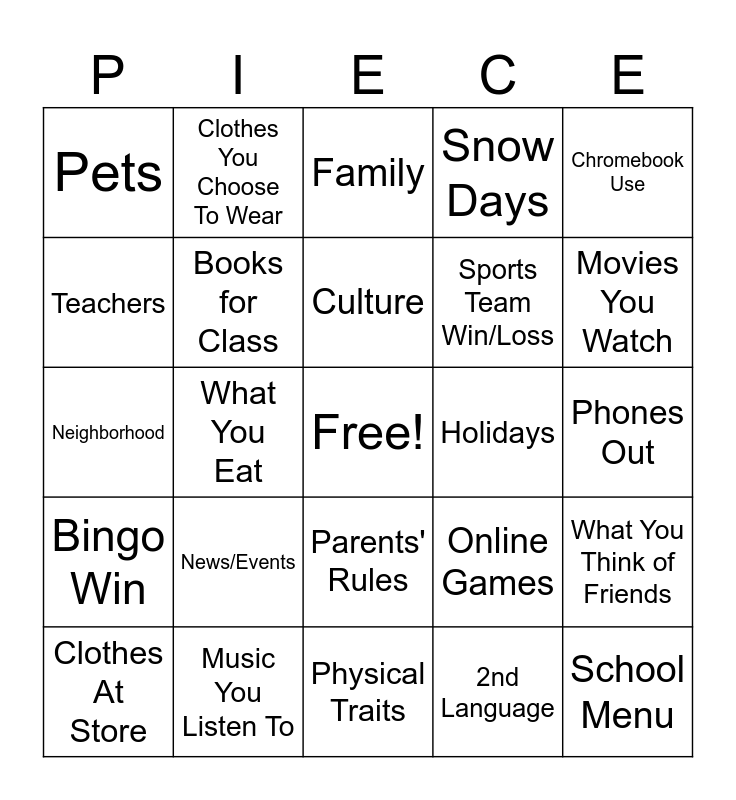 This bingo card has a free space and 34 words: 1st Language, 2nd Language, Ads You See, Age, Bingo Win, Books for Class, Chromebook Use, Clothes At Store, Clothes You Choose To Wear, Conflict/Fights, Culture, Family, Family Traditions, Friends, Holidays, Movies You Watch, Music You Listen To, Neighborhood, News/Events, Online Games, Parents' Rules, Personal Goals, Pets, Phones Out, Physical Traits, School Menu, Snow Days, Social Media Posts, Sports Team Win/Loss, Teachers, What Friends Think Of You, What You Eat, What You Think of Friends and Who Created TV Shows.