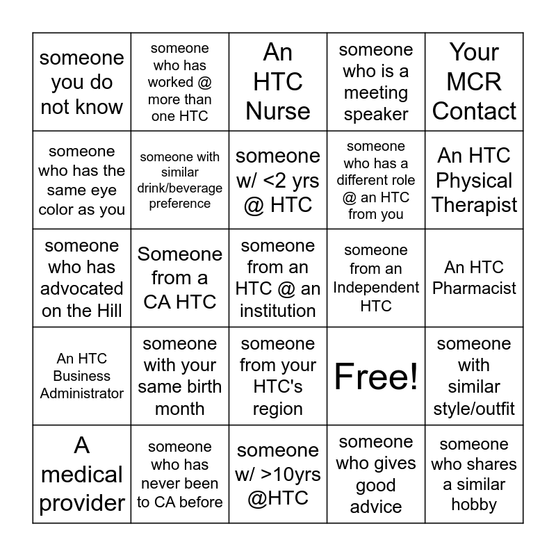 This bingo card has 25 words: someone with your same birth month, someone w/ >10yrs @HTC, someone w/ <2 yrs @ HTC, A medical provider, Your MCR Contact, someone you do not know, someone who has the same eye color as you, someone who has worked @ more than one HTC, someone from an Independent HTC, someone from your HTC's region, someone who has a different role @ an HTC from you, someone who has advocated on the Hill, Free!, someone with similar style/outfit, someone with similar drink/beverage preference, someone who shares a similar hobby, An HTC Pharmacist, An HTC Nurse, An HTC Physical Therapist, Someone from a CA HTC, someone from an HTC @ an institution, someone who has never been to CA before, An HTC Business Administrator, someone who is a meeting speaker and someone who gives good advice.