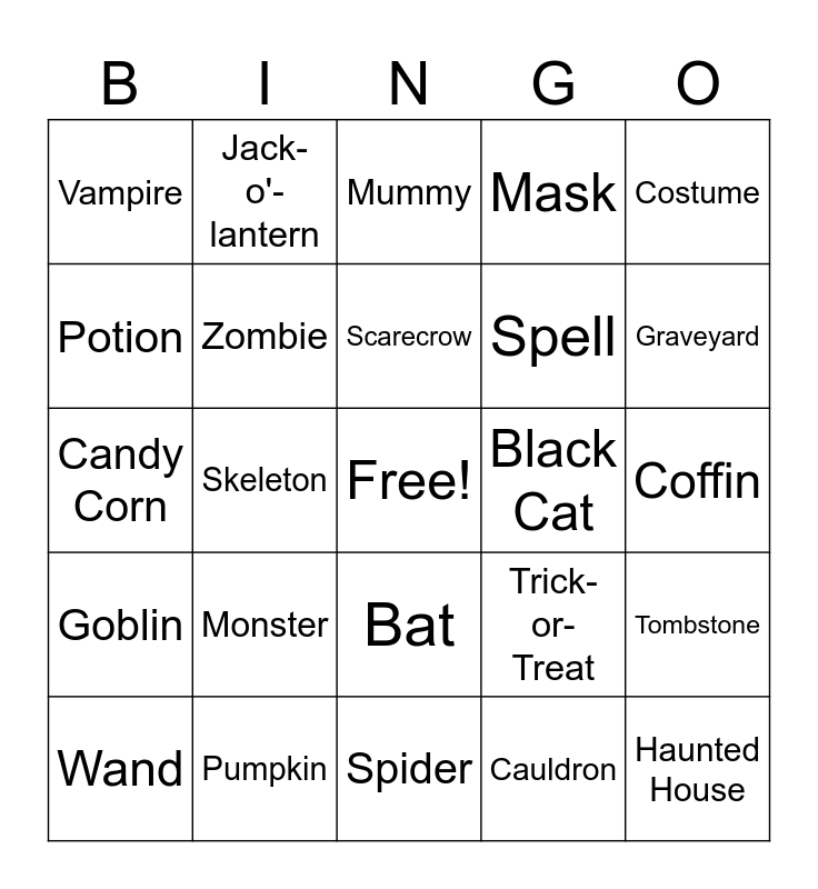 This bingo card has a free space and 30 words: Pumpkin, Ghost, Skeleton, Witch, Vampire, Mummy, Zombie, Bat, Black Cat, Spider, Coffin, Haunted House, Cauldron, Candle, Graveyard, Full Moon, Trick-or-Treat, Goblin, Monster, Costume, Candy Corn, Broomstick, Jack-o'-lantern, Spell, Potion, Mask, Tombstone, Wand, Scarecrow and Howl.