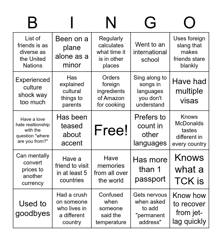 This bingo card has a free space and 24 words: Have a friend to visit in at least 5 countries, Had a crush on someone who lives in a different country, Orders foreign ingredients of Amazon for cooking, Used to goodbyes, Uses foreign slang that makes friends stare blankly, List of friends is as diverse as the United Nations, Experienced culture shock way too much, Been on a plane alone as a minor, Prefers to count in other languages, Have memories from all over the world, Sing along to songs in languages you don't understand, Have a love hate realtionship with the question "where are you from?", Has more than 1 passport, Knows what a TCK is, Has explained cultural things to parents, Gets nervous when asked to add "permanent address", Knows McDonalds tastes different in every country, Regularly calculates what time it is in other places, Have had multiple visas, Has been teased about accent, Know how to recover from jet-lag quickly, Can mentally convert prices to another currency, Went to an international school and Confused when someone said the temperature.