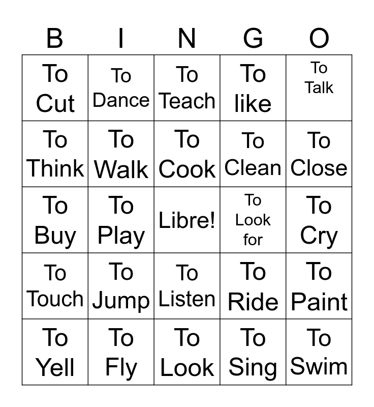 This bingo card has a free space and 24 words: To Jump, To Fly, To Cook, To Yell, To Talk, To Cut, To Think, To Dance, To Look for, To Listen, To Clean, To Buy, To Ride, To Paint, To Walk, To Sing, To Cry, To Teach, To Close, To Play, To Swim, To Touch, To like and To Look.