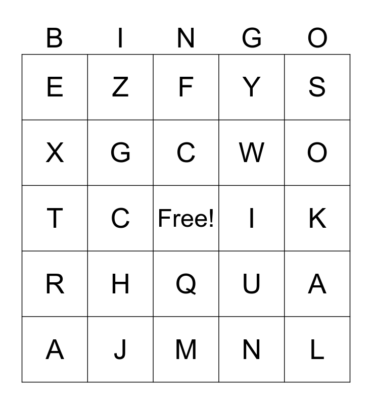 This bingo card has a free space and 29 words: A, B, C, D, E, F, G, H, I, J, K, L, M, N, O, P, Q, R, S, T, U, V, W, X, Y, Z, A, C and F.