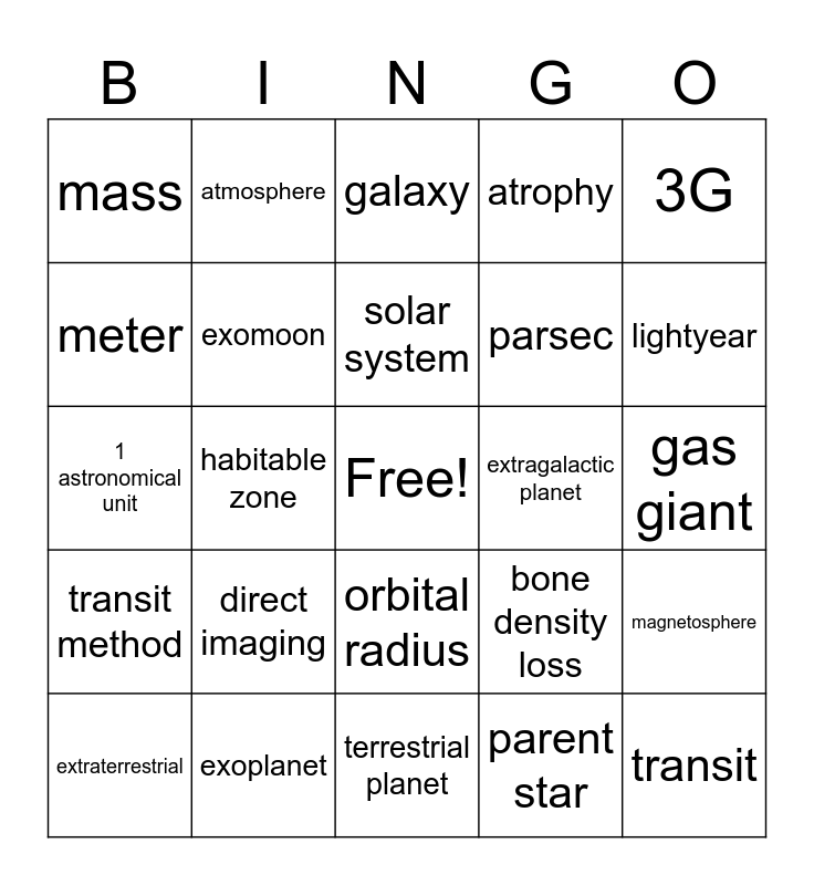 This bingo card has a free space and 29 words: extraterrestrial, tectonic activity, habitable zone, weight, mass, galaxy, exomoon, direct imaging, extragalactic planet, exoplanet, gas giant, transit, terrestrial planet, parent star, lightyear, orbital period, orbital radius, transit method, 3G, 1 astronomical unit, bone density loss, Drake equation, parsec, meter, atrophy, atmosphere, magnetosphere, solar system and F,G,K class stars.