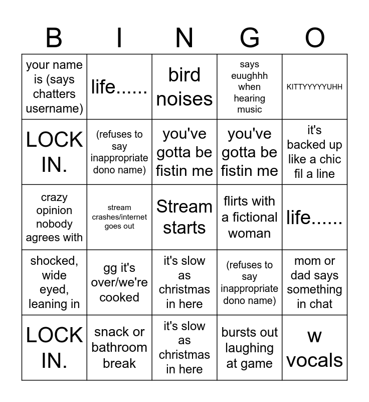 This bingo card has a free space and 39 words: unintentional comedic timing, your name is (says chatters username), ban everybody that said that, (refuses to say inappropriate dono name), LOCK IN., it's slow as christmas in here, you've gotta be fistin me, it's backed up like a chic fil a line, KITTYYYYYUHH, shocked, wide eyed, leaning in, stream crashes/internet goes out, says euughhh when hearing music, w vocals, life......, flirts with a fictional woman, gg it's over/we're cooked, unintentional comedic timing, your name is (says chatters username), ban everybody that said that, (refuses to say inappropriate dono name), LOCK IN., it's slow as christmas in here, you've gotta be fistin me, it's backed up like a chic fil a line, KITTYYYYYUHH, shocked, wide eyed, leaning in, stream crashes/internet goes out, says euughhh when hearing music, w vocals, life......, flirts with a fictional woman, gg it's over/we're cooked, bird noises, snack or bathroom break, bursts out laughing at game, fart or dookie on me, mom or dad says something in chat, crazy opinion nobody agrees with and stand corrected by chat.