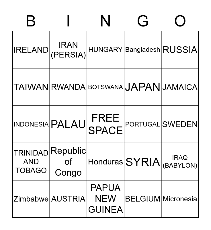 This bingo card has a free space and 29 words: Zimbabwe, NIGERIA, PALAU, GUAM (USA), IRELAND, HUNGARY, RWANDA, Republic of Congo, PORTUGAL, AUSTRIA, SWEDEN, Micronesia, PAPUA NEW GUINEA, BELGIUM, JAMAICA, MEXICO, Honduras, TRINIDAD AND TOBAGO, RUSSIA, INDONESIA, SYRIA, CANADA, JAPAN, TAIWAN, Bangladesh, IRAN (PERSIA), IRAQ (BABYLON), BOTSWANA and LIBERIA.