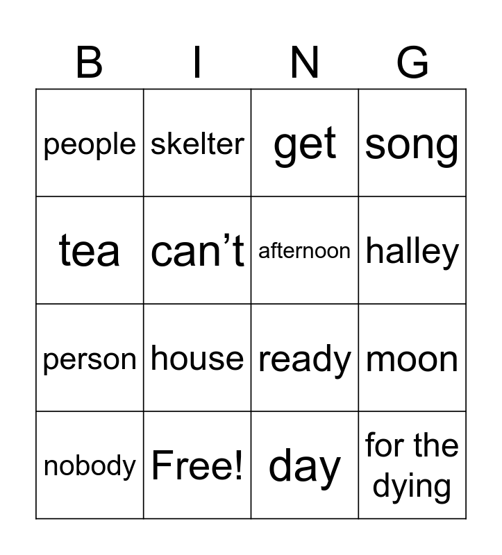 This bingo card has 21 words: Free!, helter, skelter, dog, day, afternoon, people, get, ready, halley, person, song, for the dying, we, can’t, get, nobody, house, tea, moon and river.