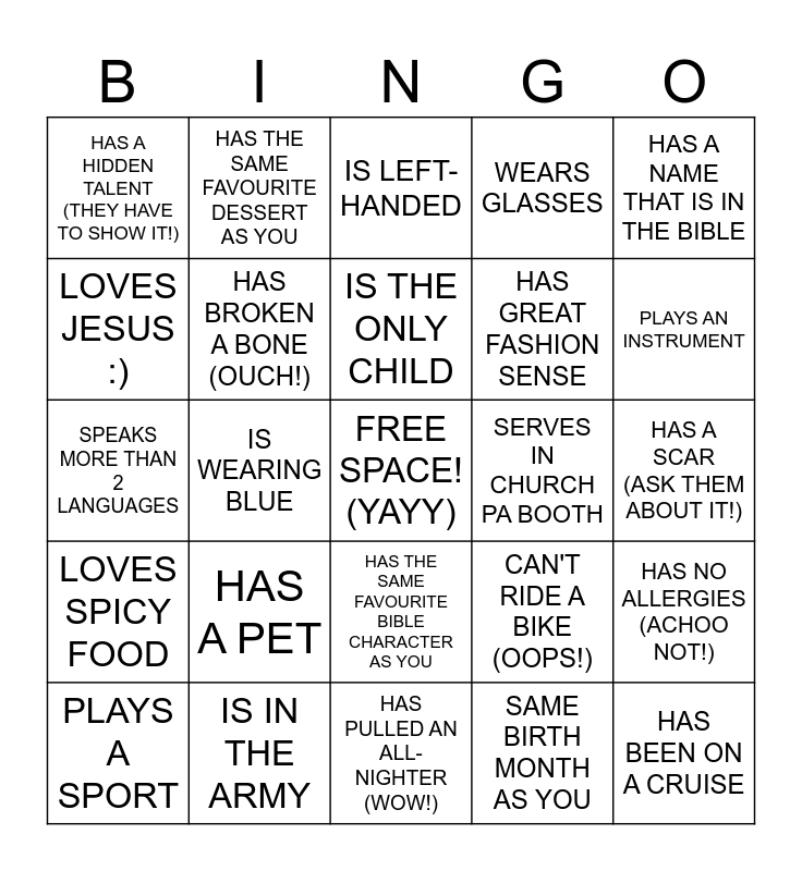 This bingo card has a free space and 24 words: HAS A PET, IS IN THE ARMY, IS THE ONLY CHILD, PLAYS A SPORT, HAS A NAME THAT IS IN THE BIBLE, HAS A HIDDEN TALENT (THEY HAVE TO SHOW IT!), LOVES JESUS :), HAS THE SAME FAVOURITE DESSERT AS YOU, SERVES IN CHURCH PA BOOTH, HAS THE SAME FAVOURITE BIBLE CHARACTER AS YOU, HAS GREAT FASHION SENSE, SPEAKS MORE THAN 2 LANGUAGES, CAN'T RIDE A BIKE (OOPS!), HAS NO ALLERGIES (ACHOO NOT!), HAS BROKEN A BONE (OUCH!), SAME BIRTH MONTH AS YOU, HAS A SCAR (ASK THEM ABOUT IT!), IS LEFT-HANDED, PLAYS AN INSTRUMENT, IS WEARING BLUE, HAS BEEN ON A CRUISE, LOVES SPICY FOOD, WEARS GLASSES and HAS PULLED AN ALL-NIGHTER (WOW!).