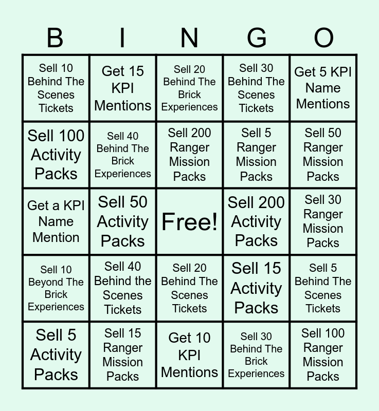 This bingo card has a free space and 24 words: Sell 5 Activity Packs, Sell 40 Behind the Scenes Tickets, Sell 200 Ranger Mission Packs, Sell 30 Behind The Brick Experiences, Get 5 KPI Name Mentions, Sell 10 Behind The Scenes Tickets, Get 15 KPI Mentions, Sell 20 Behind The Brick Experiences, Sell 200 Activity Packs, Sell 30 Ranger Mission Packs, Get a KPI Name Mention, Sell 40 Behind The Brick Experiences, Sell 15 Activity Packs, Sell 5 Behind The Scenes Tickets, Sell 100 Activity Packs, Sell 15 Ranger Mission Packs, Get 10 KPI Mentions, Sell 30 Behind The Scenes Tickets, Sell 50 Ranger Mission Packs, Sell 10 Beyond The Brick Experiences, Sell 50 Activity Packs, Sell 20 Behind The Scenes Tickets, Sell 5 Ranger Mission Packs and Sell 100 Ranger Mission Packs.
