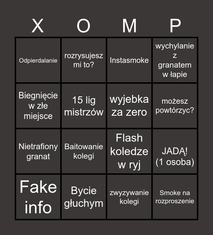 This bingo card has 16 words: Bycie głuchym, JADĄ! (1 osoba), Instasmoke, Odpierdalanie, Nietrafiony granat, rozrysujesz mi to?, Flash koledze w ryj, zwyzywanie kolegi, Biegnięcie w złe miejsce, 15 lig mistrzów, Fake info, wychylanie z granatem w łapie, Baitowanie kolegi, możesz powtórzyc?, wyjebka za zero and Smoke na rozproszenie.