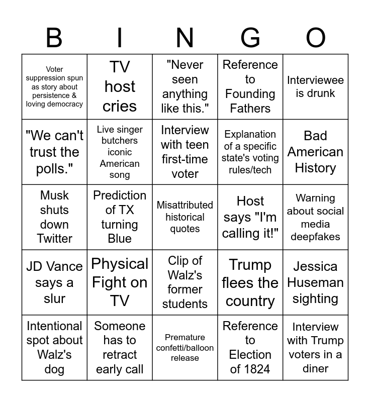 This bingo card has 25 words: Physical Fight on TV, Premature confetti/balloon release, Interview with teen first-time voter, Intentional spot about Walz's dog, Interviewee is drunk, Voter suppression spun as story about persistence & loving democracy, "We can't trust the polls.", TV host cries, Host says "I'm calling it!", Clip of Walz's former students, Explanation of a specific state's voting rules/tech, Musk shuts down Twitter, Trump flees the country, Jessica Huseman sighting, Live singer butchers iconic American song, Interview with Trump voters in a diner, Warning about social media deepfakes, "Never seen anything like this.", Bad American History, Prediction of TX turning Blue, Misattributed historical quotes, Someone has to retract early call, JD Vance says a slur, Reference to Founding Fathers and Reference to Election of 1824.