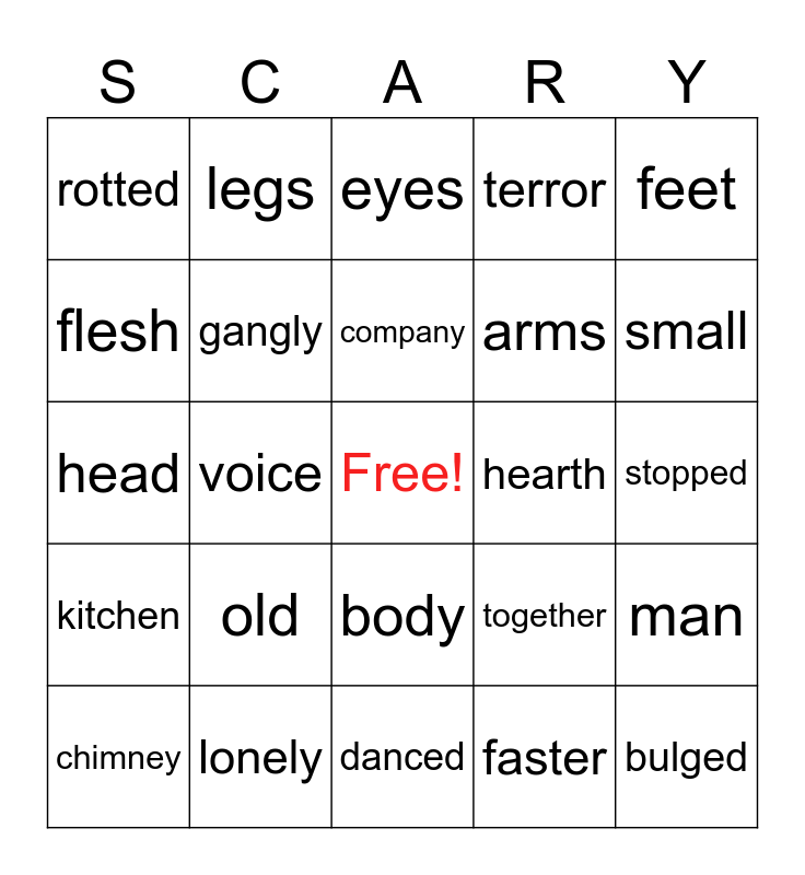This bingo card has a free space and 24 words: old, lonely, company, chimney, feet, rotted, flesh, legs, hearth, body, arms, head, together, man, gangly, faster, stopped, eyes, small, voice, bulged, kitchen, terror and danced.
