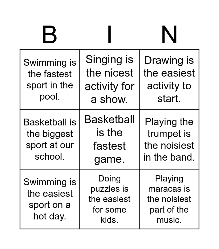 This bingo card has 18 words: Football is the biggest game on the field., The drums are the noisiest instrument., Drawing is the easiest activity to start., Swimming is the fastest sport in the pool., Playing the guitar is the nicest sound to hear., Basketball is the biggest sport at our school., Painting is the best way to be creative., Singing is the nicest activity for a show., Doing puzzles is the easiest for some kids., Playing maracas is the noisiest part of the music., Playing the piano is the nicest sound in the music room., Basketball is the fastest game., Doing puzzles is the best for thinking skills., Playing the trumpet is the noisiest in the band., Swimming is the easiest sport on a hot day., Football is the biggest game with teams., Singing is the nicest at the talent show. and Painting is the best way to make art with colors..