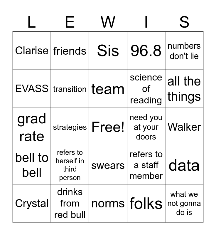This bingo card has a free space and 24 words: refers to herself in third person, drinks from red bull, team, Crystal, numbers don't lie, Clarise, EVASS, friends, need you at your doors, swears, science of reading, grad rate, refers to a staff member, data, transition, folks, Walker, Sis, all the things, strategies, what we not gonna do is, bell to bell, 96.8 and norms.