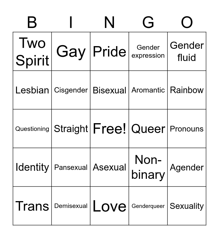 This bingo card has a free space and 24 words: Pansexual, Demisexual, Bisexual, Trans, Gender fluid, Two Spirit, Lesbian, Gay, Queer, Asexual, Aromantic, Questioning, Non-binary, Agender, Cisgender, Genderqueer, Pronouns, Pride, Rainbow, Straight, Sexuality, Identity, Gender expression and Love.