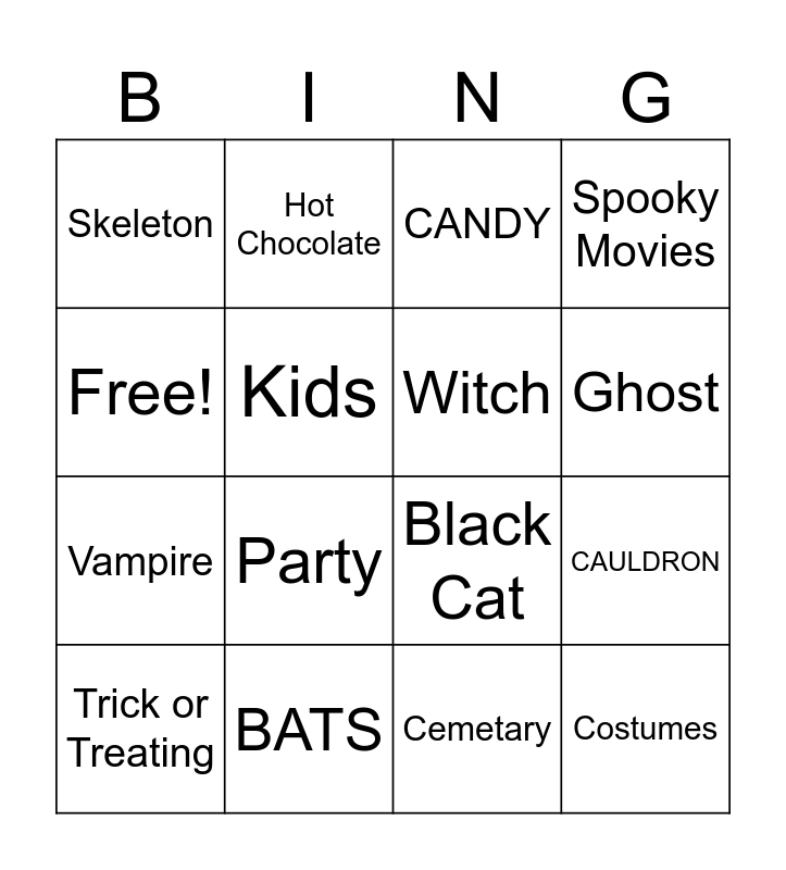 This bingo card has 16 words: BATS, CAULDRON, CANDY, Skeleton, Vampire, Hot Chocolate, Black Cat, Cemetary, Free!, Kids, Trick or Treating, Spooky Movies, Party, Ghost, Witch and Costumes.