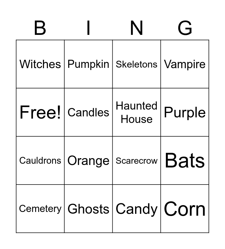 This bingo card has 16 words: Ghosts, Bats, Skeletons, Witches, Cauldrons, Pumpkin, Scarecrow, Candy, Free!, Candles, Cemetery, Vampire, Orange, Purple, Haunted House and Corn.