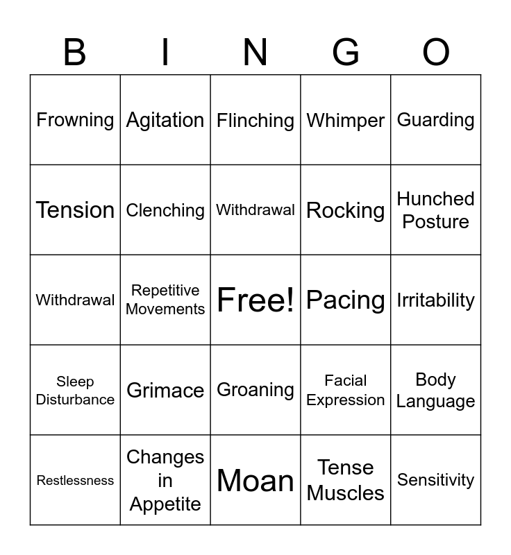 This bingo card has a free space and 25 words: Grimace, Moan, Withdrawal, Restlessness, Guarding, Frowning, Tension, Agitation, Pacing, Groaning, Rocking, Withdrawal, Facial Expression, Body Language, Clenching, Eye Contact, Irritability, Flinching, Hunched Posture, Repetitive Movements, Sensitivity, Changes in Appetite, Sleep Disturbance, Whimper and Tense Muscles.