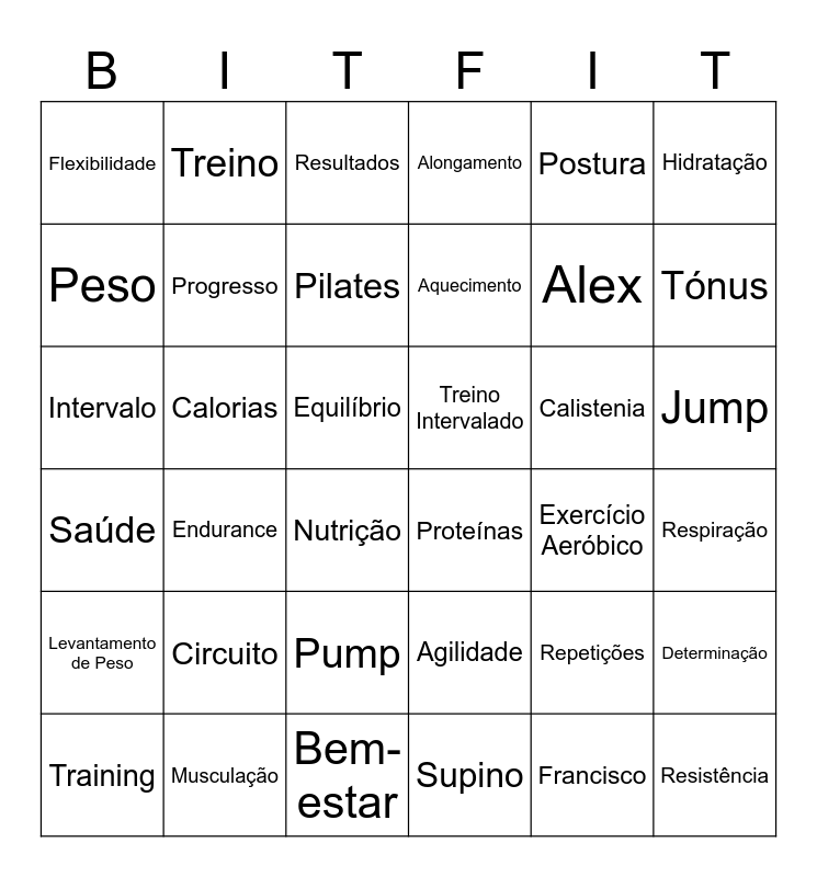 This bingo card has 73 words: Cardio, Musculação, Flexibilidade, Resistência, Força, Energia, Treino Intervalado, Mobilidade, Saúde, Agachamento, Levantamento de Peso, Alimentação, Peso, Equilíbrio, Abdominais, Treino, Exercício Aeróbico, Hidratação, Metabolismo, Calorias, Progresso, Alongamento, Postura, Circuito, Nutrição, Ginástica, Concentração, Endorfina, Bem-estar, Flexão de Braços, Proteínas, Kettlebell, Yoga, Crescimento Muscular, Tónus, Repetições, Grupo 2:, Cardio-fitness, Intervalo, Supino, Respiração, Calistenia, Autocuidado, Peso Livre, Saúde Mental, Pilates, Resultados, Determinação, Disciplina, Alex, Francisco, Silva, Cardoso, Cycling, Pump, Core, Step, Jump, Training, Games, Athletic, Active, Kimax, Aquecimento, Agilidade, Resistência Cardíaca, Tórax, Prancha, Endurance, Intensidade, Treino de Força, Balanço and Agachamento Frontal.