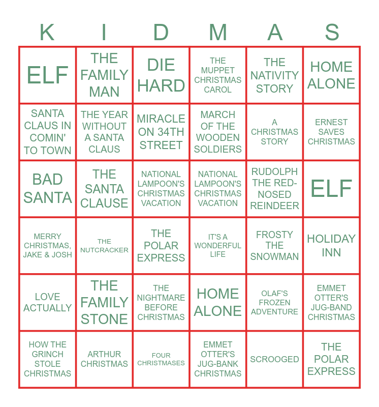 ⚠ This card has duplicate items: A CHRISTMAS STORY (3), RUDOLPH THE RED-NOSED REINDEER (2), NATIONAL LAMPOON'S CHRISTMAS VACATION (2), A CHARLIE BROWN CHRISTMAS (2), HOME ALONE (3), ELF (3), FROSTY THE SNOWMAN (3), THE POLAR EXPRESS (2), THE NIGHTMARE BEFORE CHRISTMAS (2), SCROOGED (2), MERRY CHRISTMAS, JAKE & JOSH (2)