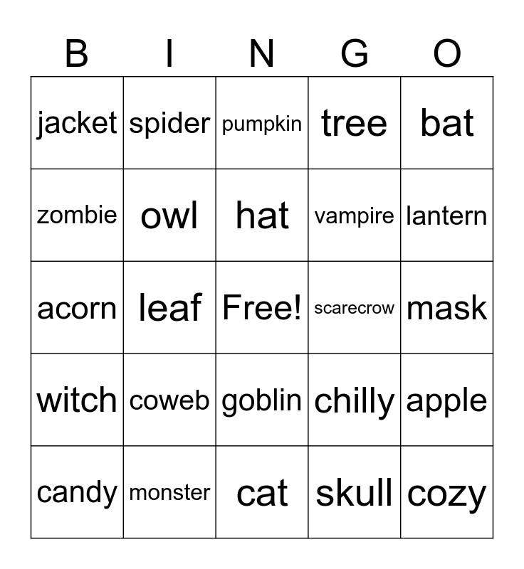 This bingo card has a free space and 24 words: coweb, monster, hat, candy, bat, jacket, zombie, spider, scarecrow, goblin, vampire, acorn, chilly, apple, owl, skull, mask, pumpkin, lantern, leaf, cozy, witch, tree and cat.
