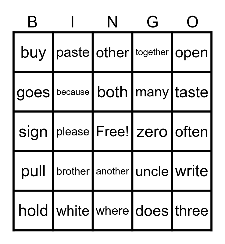 This bingo card has a free space and 24 words: brother, white, both, hold, open, buy, goes, paste, zero, another, many, sign, uncle, write, because, does, often, other, taste, please, three, pull, together and where.