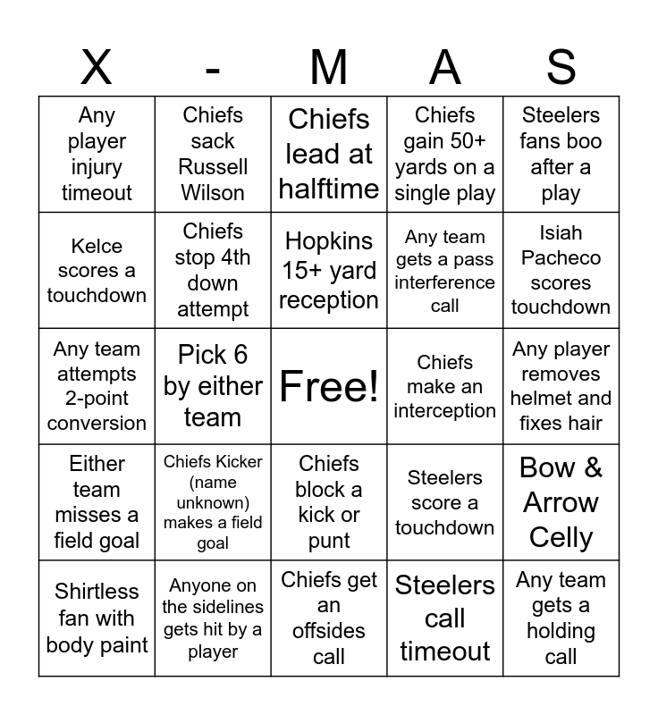 This bingo card has a free space and 34 words: Taylor Swift shows shocked face, Steelers call timeout, Andy Reid challenges a play, End zone choreographed dance, Either team misses a field goal, Chiefs stop 4th down attempt, Steelers fans boo after a play, Shirtless fan with body paint, Chiefs sack Russell Wilson, Any player makes a one handed catch, Hopkins 15+ yard reception, Chiefs lead at halftime, Mahomes rushes for a first down, Mike Tomlin looks frustrated or yells, Chiefs make an interception, Isiah Pacheco scores touchdown, Anyone on the sidelines gets hit by a player, Any team attempts 2-point conversion, Chiefs Kicker (name unknown) makes a field goal, Steelers score a touchdown, Chiefs block a kick or punt, Chiefs recover a fumble, Any player injury timeout, Any player removes helmet and fixes hair, Chiefs get an offsides call, Any team gets a holding call, Chiefs gain 50+ yards on a single play, Chiefs convert a 4th down, Any team gets a pass interference call, Kelce scores a touchdown, Fans do the tomahawak chop, Pick 6 by either team, Bow & Arrow Celly and Opening drive score by either team.