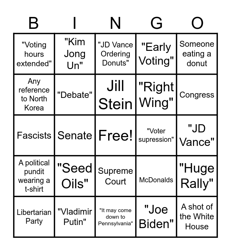 This bingo card has a free space and 24 words: "Seed Oils", "Vladimir Putin", Jill Stein, Libertarian Party, Someone eating a donut, "Voting hours extended", Any reference to North Korea, "Kim Jong Un", "Voter supression", Supreme Court, "Right Wing", Fascists, McDonalds, "Huge Rally", "Debate", "Joe Biden", "JD Vance", "JD Vance Ordering Donuts", Congress, Senate, A shot of the White House, A political pundit wearing a t-shirt, "Early Voting" and "It may come down to Pennsylvania".