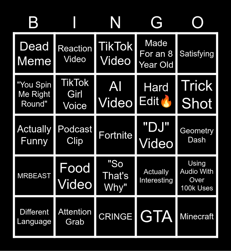 This bingo card has 25 words: MRBEAST, Attention Grab, Fortnite, GTA, Satisfying, Dead Meme, Reaction Video, TikTok Video, "DJ" Video, Using Audio With Over 100k Uses, "You Spin Me Right Round", TikTok Girl Voice, CRINGE, Actually Interesting, Trick Shot, Different Language, Podcast Clip, AI Video, Hard Edit🔥, Geometry Dash, Actually Funny, Food Video, "So That's Why", Made For an 8 Year Old and Minecraft.