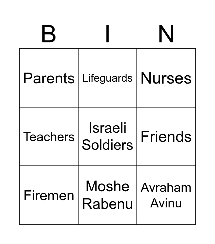 This bingo card has 9 words: Firemen, Nurses, Lifeguards, Teachers, Parents, Friends, Israeli Soldiers, Avraham Avinu and Moshe Rabenu.