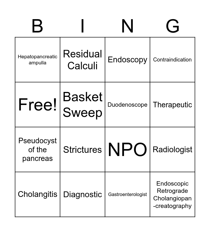 This bingo card has 16 words: Diagnostic, Radiologist, Endoscopy, Hepatopancreatic ampulla, Pseudocyst of the pancreas, Residual Calculi, NPO, Gastroenterologist, Free!, Basket Sweep, Cholangitis, Contraindication, Strictures, Therapeutic, Duodenoscope and Endoscopic Retrograde Cholangiopan -creatography.