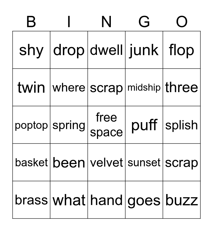 This bingo card has a free space and 24 words: been, what, scrap, brass, flop, shy, twin, drop, puff, velvet, midship, poptop, sunset, scrap, where, goes, splish, dwell, three, spring, buzz, basket, junk and hand.
