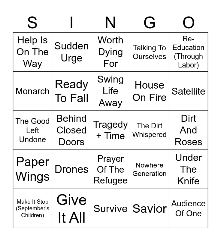 This bingo card has 26 words: Prayer Of The Refugee, Savior, Swing Life Away, Give It All, Re-Education (Through Labor), Help Is On The Way, Monarch, Sudden Urge, Dirt And Roses, Nowhere Generation, House On Fire, The Good Left Undone, Under The Knife, Make It Stop (September's Children), Behind Closed Doors, I Don’t Want To Be Here Anymore, Talking To Ourselves, Paper Wings, Worth Dying For, Tragedy + Time, Satellite, Survive, The Dirt Whispered, Drones, Ready To Fall and Audience Of One.