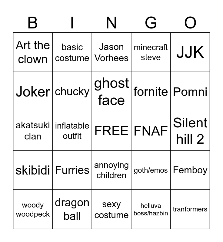 This bingo card has a free space and 24 words: woody woodpeck, Furries, ghost face, helluva boss/hazbin, JJK, Art the clown, basic costume, Jason Vorhees, FNAF, Silent hill 2, akatsuki clan, chucky, goth/emos, Femboy, Joker, dragon ball, sexy costume, minecraft steve, Pomni, skibidi, inflatable outfit, annoying children, fornite and tranformers.