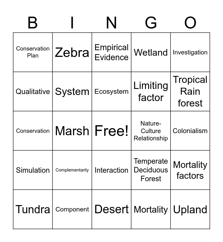 This bingo card has a free space and 40 words: 30 by 30 Initiative, Conservation, Criteria, System, Component, Interaction, Ecosystem, Model, Investigation, Simulation, Marsh, Wetland, Upland, Colonialism, Nature-Culture Relationship, Complementarity, Biodiversity, Conservation Plan, Poaching, Empirical Evidence, Mortality factors, Mortality, Limiting factor, Qualitative, Algorithm, Carrying capacity, Migration, Positive, Negative, Strong relationship, Weak relationship, Tundra, Taiga, Temperate Deciduous Forest, Tropical Rain forest, Desert, Grassland, Wildebeest, Zebra and Thomson's Gazelle.