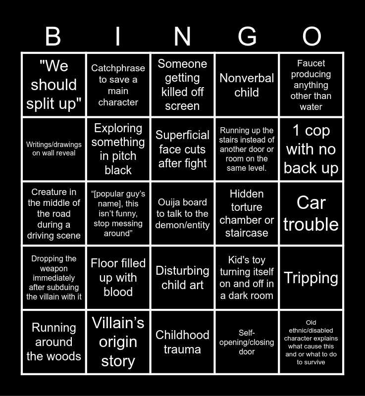 This bingo card has 35 words: Phone call cuts to dial tone, No signal/ battery low/ no reception, Character sees something in reflection, turns around and there’s nothing there, Exploring something in pitch black, Disturbing child art, Nonverbal child, Writings/drawings on wall reveal, Any black animal, Superficial face cuts after fight, Suspicious religious figure, Creature in the middle of the road during a driving scene, Faucet producing anything other than water, Video glitch on found footage or CCTV, Unthreatening jumpscare, "We should split up", Hidden torture chamber or staircase, Self-opening/closing door, “[popular guy’s name], this isn’t funny, stop messing around”, Dropping the weapon immediately after subduing the villain with it, Ouija board to talk to the demon/entity, Kid's toy turning itself on and off in a dark room, Running around the woods, Tripping, Villain’s origin story, Someone getting killed off screen, 1 cop with no back up, Old ethnic/disabled character explains what cause this and or what to do to survive, October, Running up the stairs instead of another door or room on the same level., Car trouble, Intentional wounds for ritual, Childhood trauma, Floor filled up with blood, Catchphrase to save a main character and Sequel bait with no sequel.