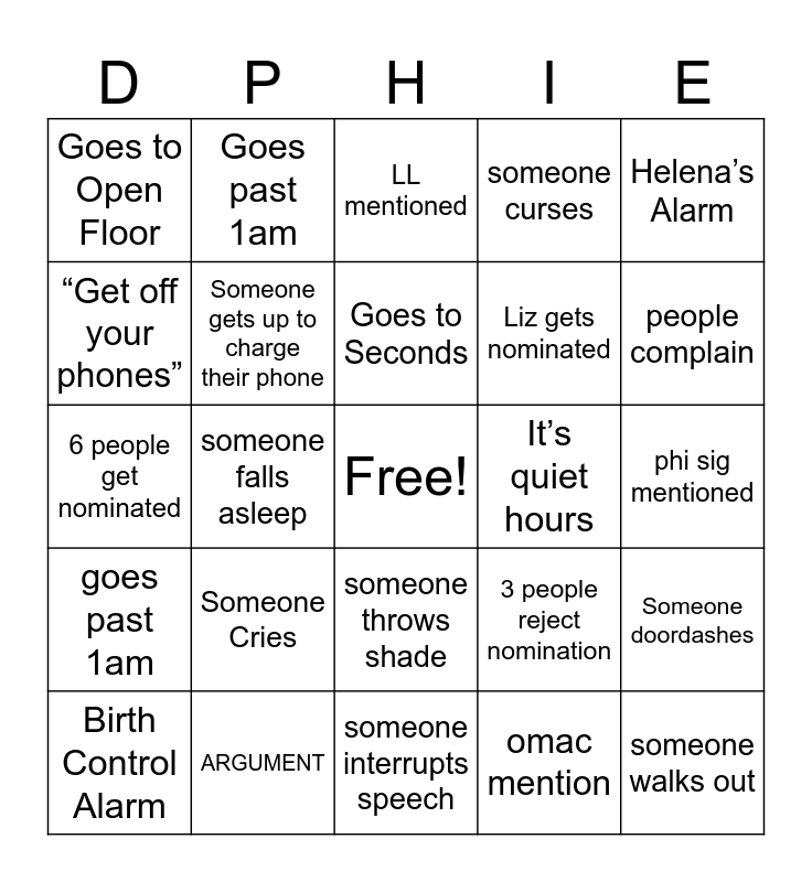 This bingo card has a free space and 24 words: Someone Cries, ARGUMENT, Goes to Seconds, Birth Control Alarm, Helena’s Alarm, Goes to Open Floor, “Get off your phones”, Goes past 1am, It’s quiet hours, someone throws shade, Liz gets nominated, 6 people get nominated, 3 people reject nomination, Someone doordashes, Someone gets up to charge their phone, omac mention, phi sig mentioned, LL mentioned, people complain, someone falls asleep, someone walks out, goes past 1am, someone curses and someone interrupts speech.