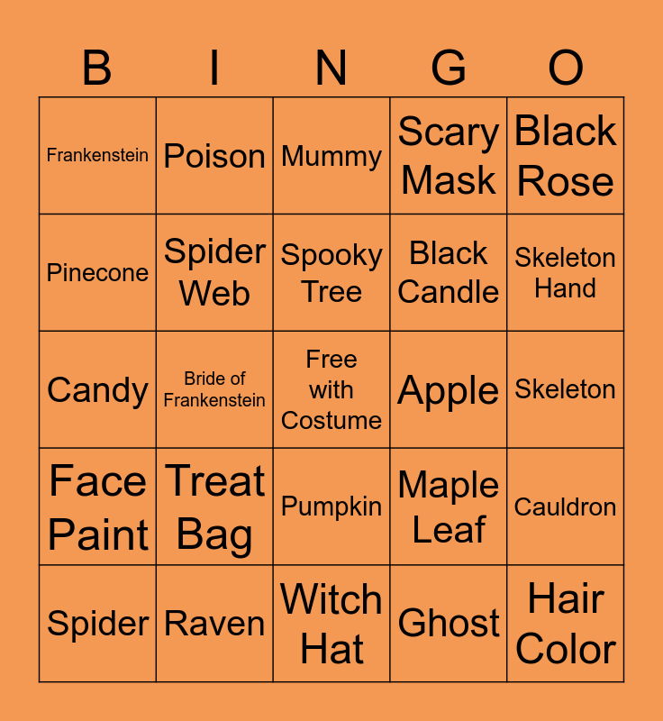 This bingo card has a free space and 24 words: Treat Bag, Raven, Spooky Tree, Spider, Black Rose, Frankenstein, Pinecone, Poison, Apple, Pumpkin, Black Candle, Candy, Maple Leaf, Cauldron, Spider Web, Ghost, Skeleton, Mummy, Skeleton Hand, Bride of Frankenstein, Hair Color, Face Paint, Scary Mask and Witch Hat.