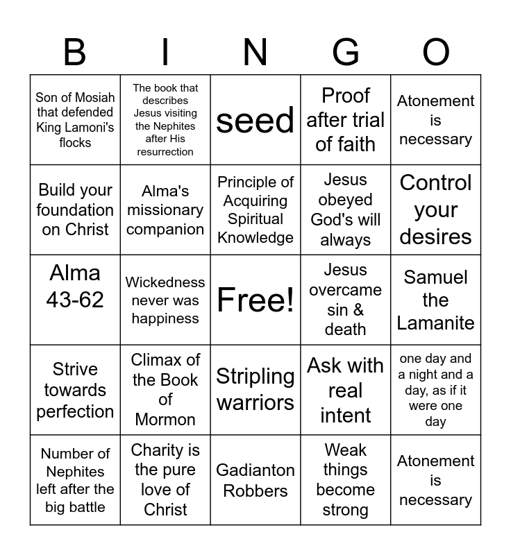 This bingo card has a free space and 24 words: Climax of the Book of Mormon, Charity is the pure love of Christ, Principle of Acquiring Spiritual Knowledge, Number of Nephites left after the big battle, Atonement is necessary, Son of Mosiah that defended King Lamoni's flocks, Build your foundation on Christ, The book that describes Jesus visiting the Nephites after His resurrection, Jesus overcame sin & death, Stripling warriors, Jesus obeyed God's will always, Alma 43-62, Ask with real intent, one day and a night and a day, as if it were one day, Alma's missionary companion, Weak things become strong, Samuel the Lamanite, seed, Control your desires, Wickedness never was happiness, Atonement is necessary, Strive towards perfection, Proof after trial of faith and Gadianton Robbers.