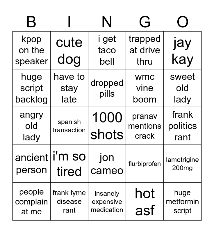 This bingo card has 25 words: i'm so tired, insanely expensive medication, dropped pills, people complain at me, jay kay, kpop on the speaker, huge script backlog, cute dog, pranav mentions crack, jon cameo, wmc vine boom, angry old lady, flurbiprofen, lamotrigine 200mg, have to stay late, huge metformin script, frank politics rant, i get taco bell, sweet old lady, spanish transaction, 1000 shots, frank lyme disease rant, ancient person, trapped at drive thru and hot asf.