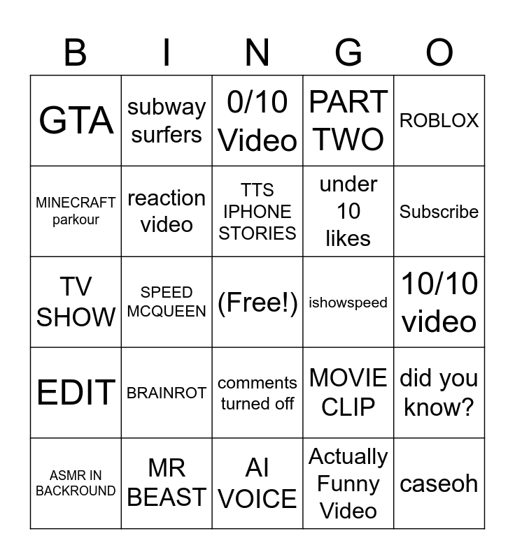This bingo card has a free space and 24 words: BRAINROT, MR BEAST, TTS IPHONE STORIES, ASMR IN BACKROUND, ROBLOX, GTA, MINECRAFT parkour, subway surfers, ishowspeed, comments turned off, under 10 likes, TV SHOW, MOVIE CLIP, did you know?, reaction video, Actually Funny Video, 10/10 video, 0/10 Video, Subscribe, SPEED MCQUEEN, caseoh, EDIT, PART TWO and AI VOICE.