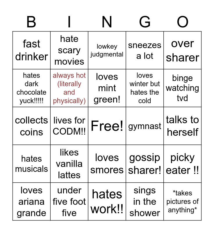 This bingo card has a free space and 24 words: likes vanilla lattes, under five foot five, loves mint green!, loves ariana grande, over sharer, fast drinker, hates dark chocolate yuck!!!!!, hate scary movies, gymnast, loves smores, loves winter but hates the cold, collects coins, gossip sharer!, picky eater !!, always hot (literally and physically), sings in the shower, talks to herself, lowkey judgmental, binge watching tvd, lives for CODM!!, *takes pictures of anything*, hates musicals, sneezes a lot and hates work!!.