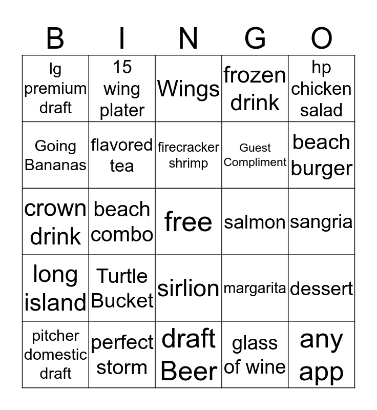 This bingo card has a free space and 24 words: Turtle Bucket, perfect storm, firecracker shrimp, pitcher domestic draft, hp chicken salad, lg premium draft, Going Bananas, 15 wing plater, salmon, sirlion, Guest Compliment, crown drink, margarita, dessert, flavored tea, glass of wine, sangria, Wings, beach burger, beach combo, any app, long island, frozen drink and draft Beer.