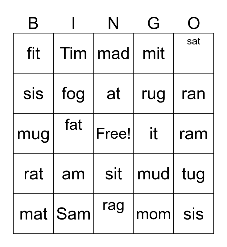 This bingo card has a free space and 24 words: am, Sam, at, mat, sat, fit, sis, Tim, it, sit, rug, mug, mud, tug, fog, mom, ram, mad, ran, fat, sis, rat, mit and rag.