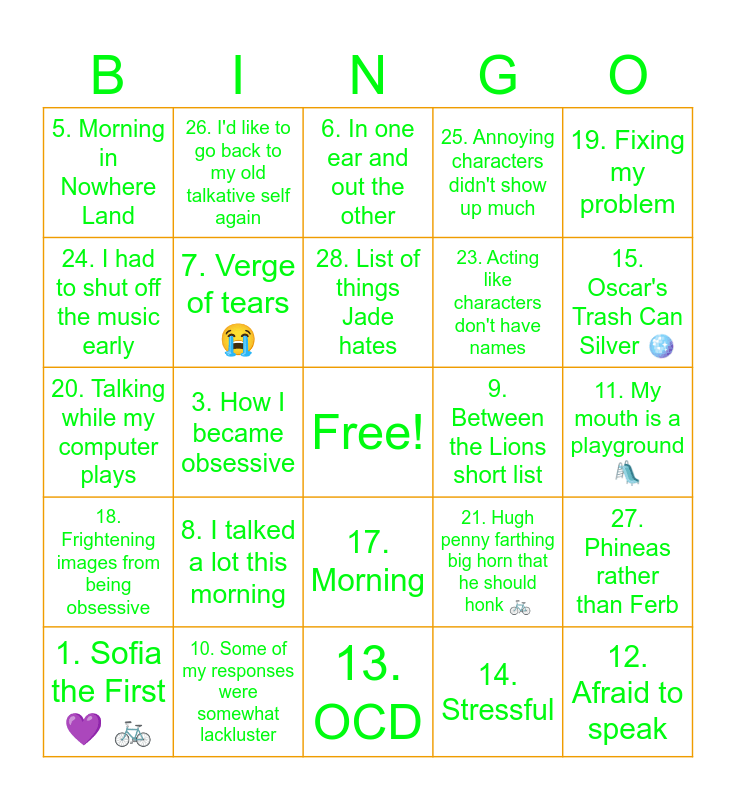 This bingo card has a free space and 29 words: 1. Sofia the First ๐ ๐ฒ, 2. Oswald ๐ ๐, 3. How I became obsessive, 4. Barely watched any Avenue Q, 5. Morning in Nowhere Land, 6. In one ear and out the other, 7. Verge of tears ๐ญ, 8. I talked a lot this morning, 9. Between the Lions short list, 10. Some of my responses were somewhat lackluster, 11. My mouth is a playground ๐, 12. Afraid to speak, 13. OCD, 14. Stressful, 15. Oscar's Trash Can Silver ๐ชฉ, 16. Out of whack, 17. Morning, 18. Frightening images from being obsessive, 19. Fixing my problem, 20. Talking while my computer plays, 21. Hugh penny farthing big horn that he should honk ๐ฒ, 22. Barely talked when I came down, 23. Acting like characters don't have names, 24. I had to shut off the music early, 25. Annoying characters didn't show up much, 26. I'd like to go back to my old talkative self again, 27. Phineas rather than Ferb, 28. List of things Jade hates and 29. Not thinking straight.